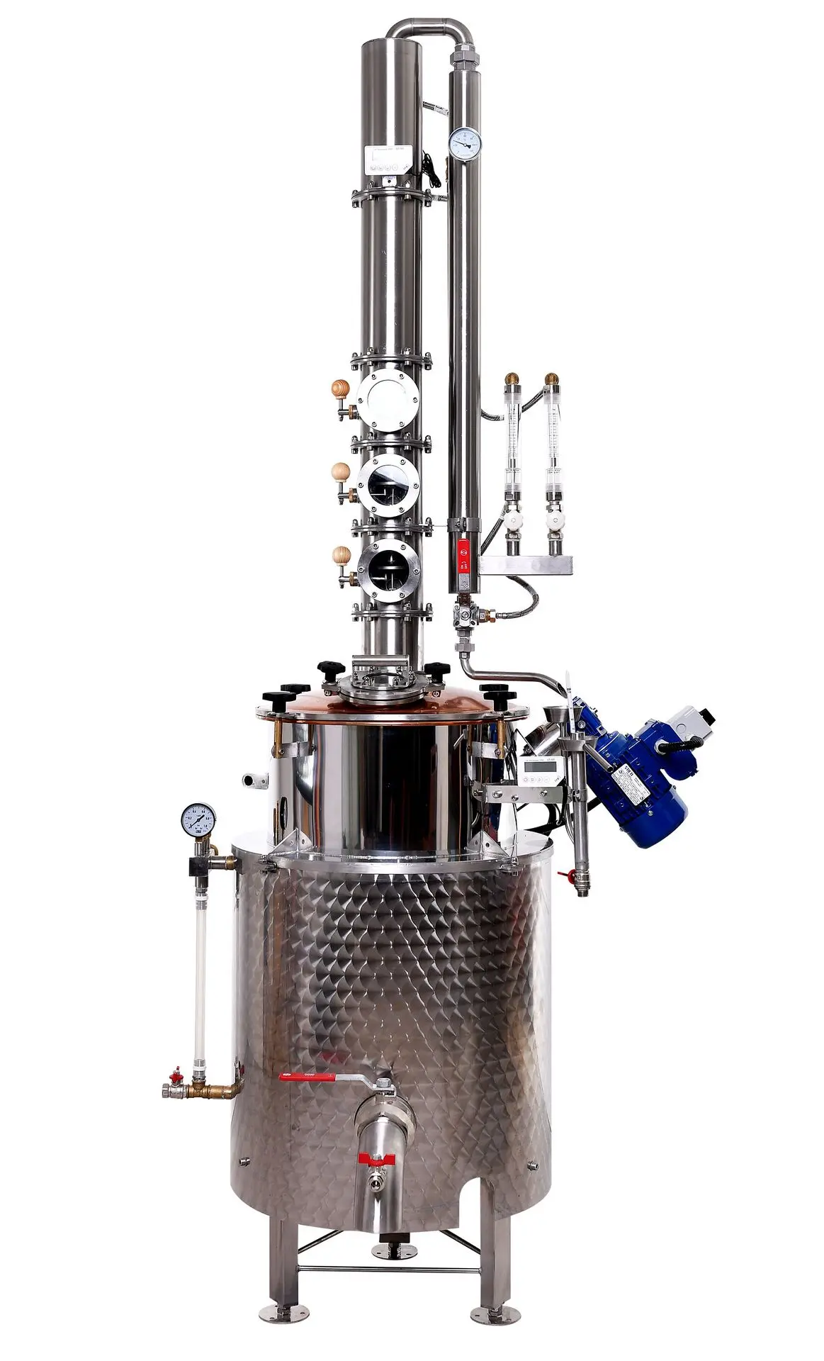 Az élelmiszeripari rozsdamentes acélból készült, 114 mm átmérőjű oszlop szétszedhető részekből áll, ami lehetővé teszi könnyű tisztítását és karbantartását. A moduláris karima kötések és a szilikon tömítés biztosítják a szivárgásmentes zárást. Az indító idom megakadályozza, hogy a forrás közben felcsapódó darabok az első tányérba kerüljenek. A szitatányéros oszloprész gyors és hatékony anyagátadást tesz lehetővé, stabilizálja a folyadékszintet, és szabályozható a lepárlás folyamata. A peremezett nézőüvegek higiénikus megoldást kínálnak a lepárlás követésére és szabályozására, míg az üvegen keresztül láthatóak a lepárlási folyamat fontos paraméterei.